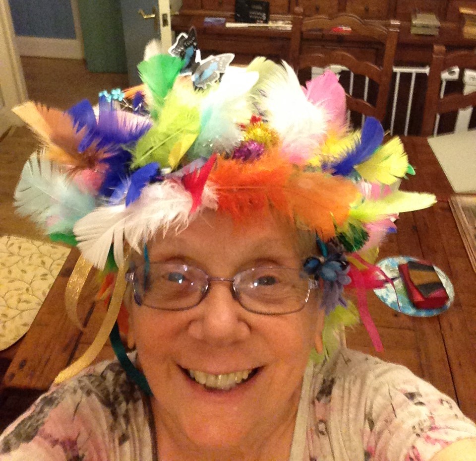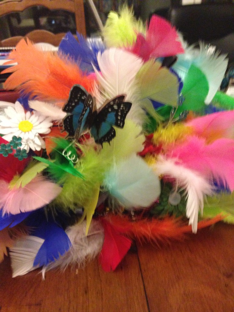 During summer 2017, I made a feather hat to protect my head. I used colourful pipe-cleaners and ribbons to make the framework and decorated it with feathers, butterflies, crystal flowers and bobbles The gaps in the frame let air through.